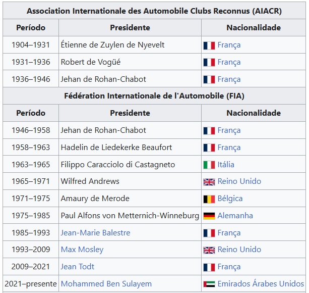 O atual presidente é o emiradense Mohammed Ben Sulayem, eleito em 2021.