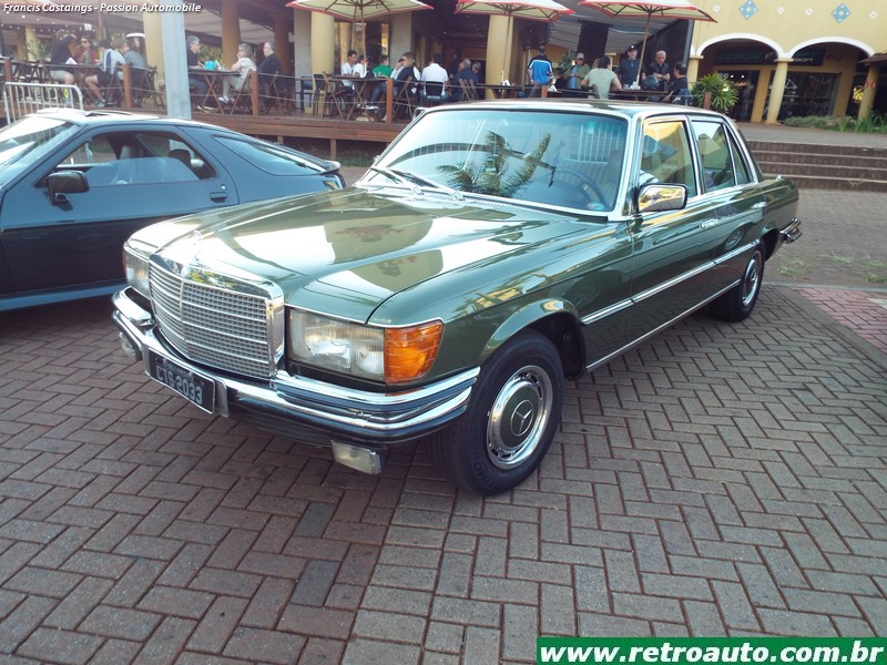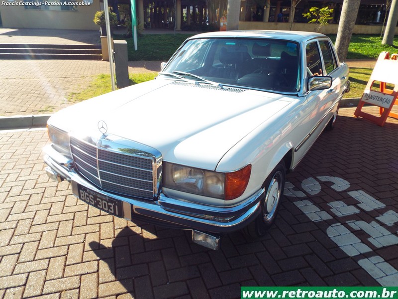 Um Mercedes-Benz Classe W116 280 SEL, 1972-1980, o primeiro classe S. Seis cilindros em linha, 2,8 litros de cilindrada e velocidade final de 200 km/h, 0 a 100 km/h em 10,5 segundos