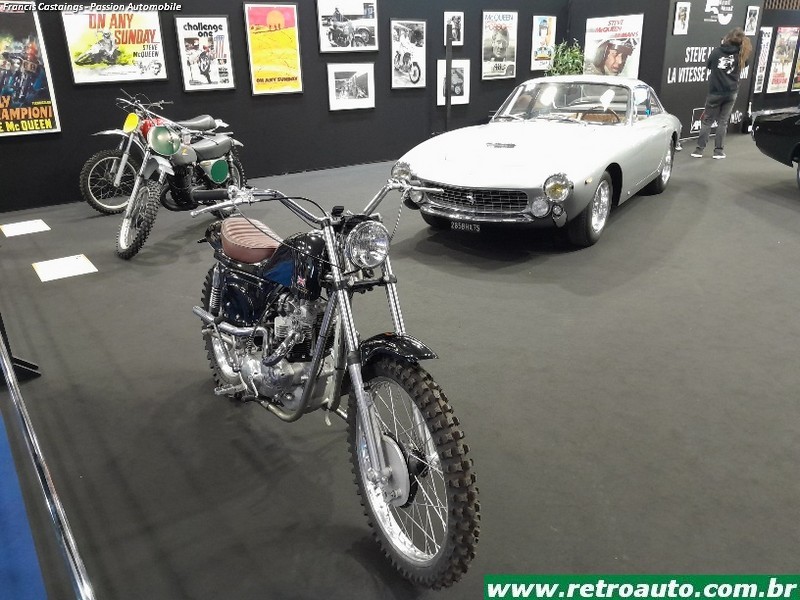 Embora seu trabalho no cinema o tenha mantido temporariamente afastado das corridas de moto, ele preencheu o vazio mexendo em suas máquinas e pilotando algumas delas até os sets de filmagem. Por exemplo, entre as cenas de *Os Canhões de San Pablo *, ele aproveitava seu tempo livre para escapar em uma Suzuki carenada com escapamento direto, idêntica à sua moto de corrida. Sem capacete, é claro! No Rétromobile , a exposição de Steve McQueen apresenta diversas máquinas que contam a história de sua paixão por motocicletas : as seis Triumph de fábrica preparadas para o ISDT de 1963, uma das 300 reedições da Triumph Rickman Métisse MK3 de 1966 , a Triumph N13 Bud Ekins Desert Slade de 1963 , a Triumph TR6 de *Fugindo do Inferno* e a Husqvarna 400 Cross de 1971, para citar apenas algumas. Acima seu Ferrari 250 GT Lusso derivado do 250 SWB