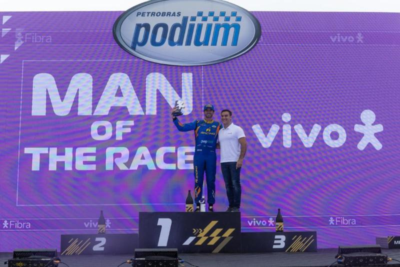Abre aspas — Thiago Camilo enalteceu o fim de semana praticamente impecável com pole, vitória de ponta a ponta e o Troféu Vivo Man of the Race de maior pontuador em Campo Grande. “Foi muito bom e só posso agradecer a todo o trabalho da Ipiranga Racing. Saímos de um fim de semana muito ruim no Velocitta, sem performance, e apesar de ter feito boas corridas, sabíamos que faltava um pouquinho. O time trabalhou muito nesse intervalo que tivemos. Foram noites viradas para recuperar a competitividade, e estou muito feliz por saber do nosso poder de reação em uma fase importante do campeonato. Sei que os carros do Meinha [Rosinei Campos, chefe da Eurofarma RC] estão muito fortes, muito constantes, mas com certeza vai ser uma briga muito dura para busca-los no campeonato. Foi um resultado para se comemorar muito”, destacou o vencedor.